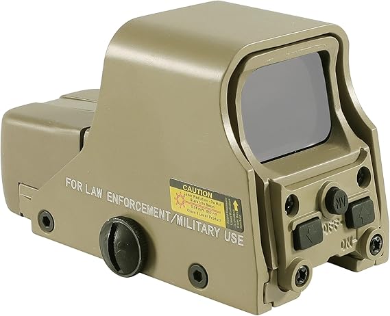 The holographic sight features a dual reticle system allowing users to switch between red and green dots. Each reticle comes with five brightness levels to maintain visibility in bright daylight or low-light environments.