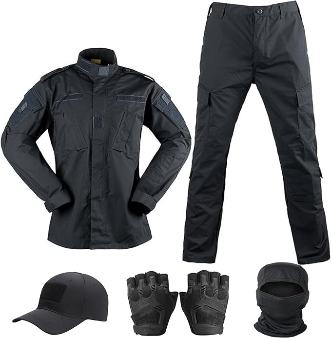 4. Tactical Suit,Combat Pants and Shirt,Cap Gloves Balaclava Set,Black Camo Uniform
